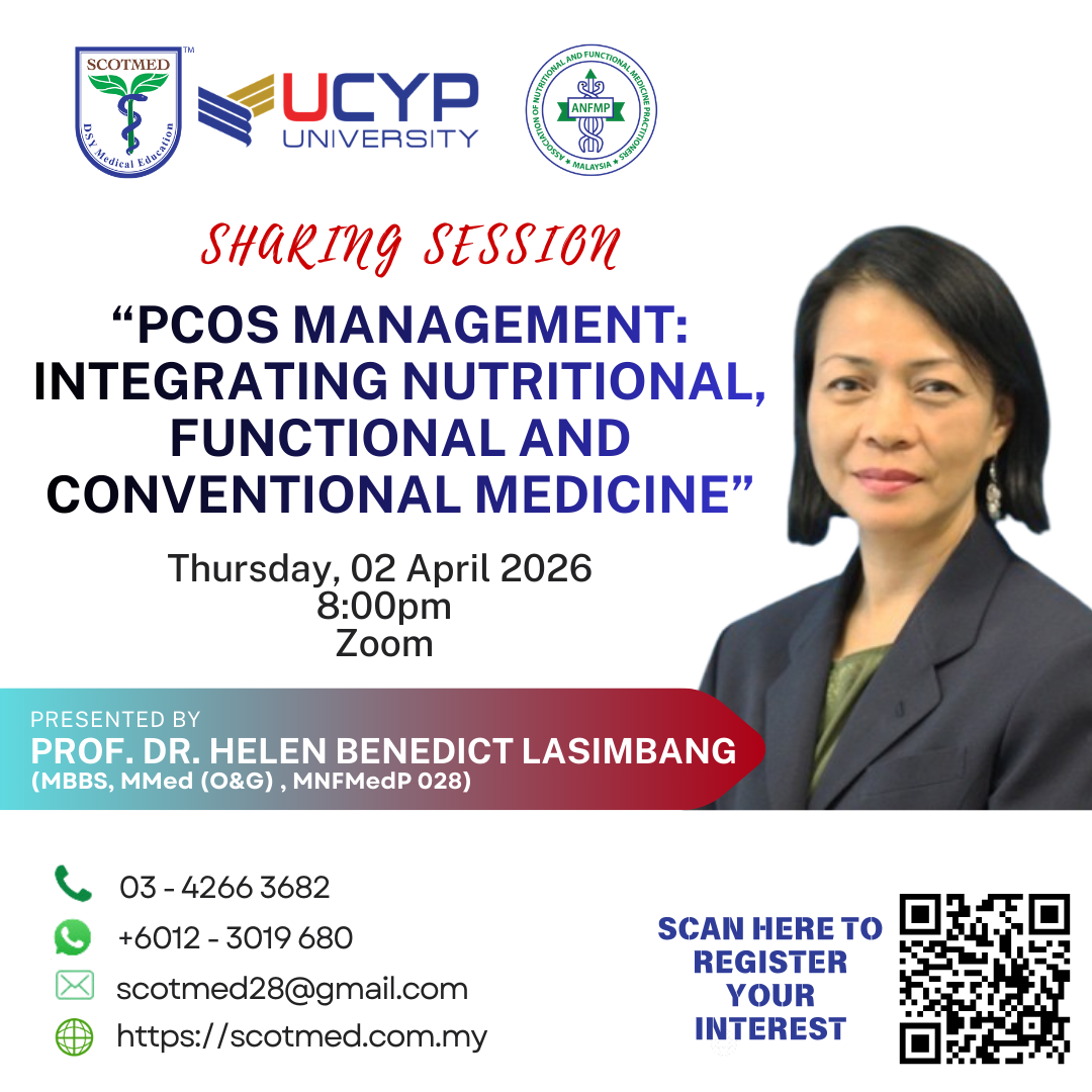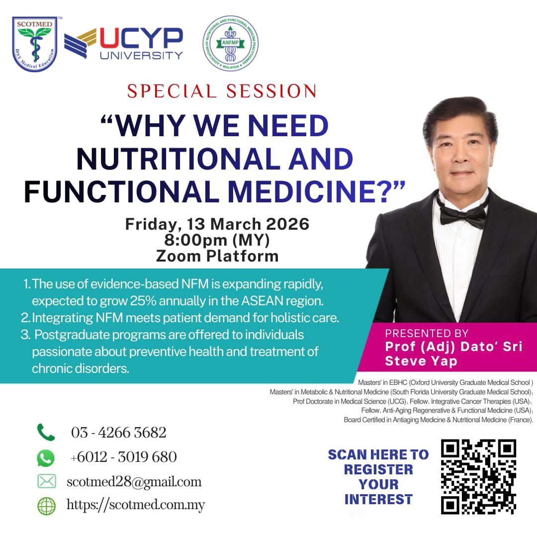 Advance your understanding of health and disease through a structured, evidence-based approach to Nutritional and Functional Medicine (NFM), delivered by SCOTMED. We invite you to join a special sharing session by Dr. Mugilarasi, who will present on: “Inflammation: The Invisible Threat” In this session, you will learn about: How inflammation silently drives many diseases How...