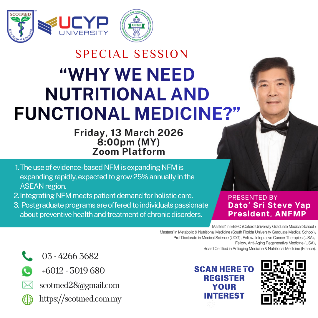 Advance your understanding of health and disease through a structured, evidence-based approach to Nutritional and Functional Medicine (NFM), delivered by SCOTMED. We invite you to join a special sharing session by Dr. Mugilarasi, who will present on: “Nutritional and Functional Medicine in Metabolic Diseases” In this session, you will learn about: ✔ Metabolic diseases at...Read More